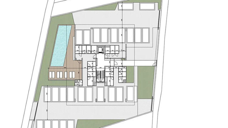 The 3-bedroom top-floor apartments feature a private roof garden with a pool